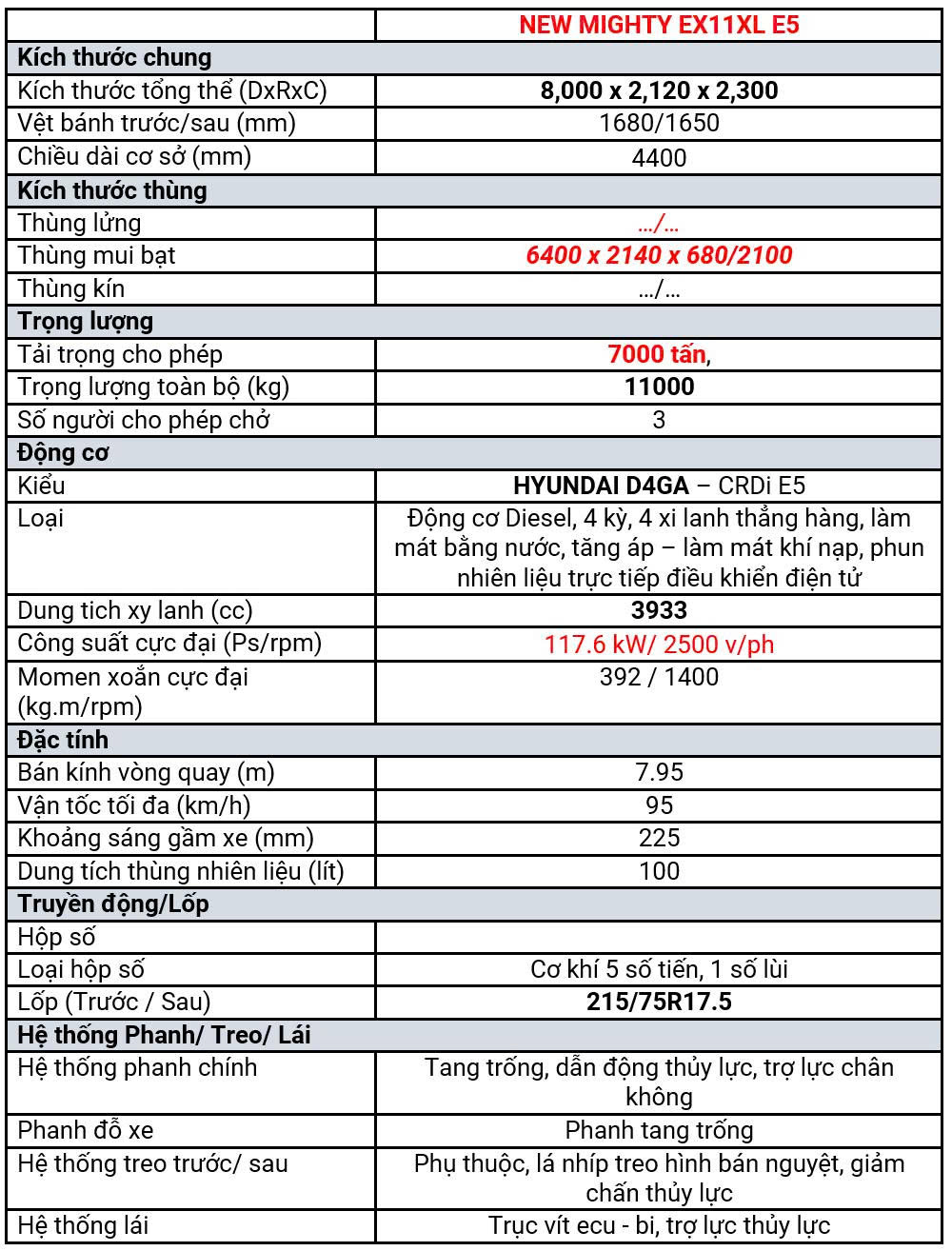 MIGHTY EX11XL là sản phẩm mới ra mắt tháng 4 năm 2025. Với thiết kế cabin vuông, sử dụng động cơ D4GA có công suất 160ps. Trang bị Hệ thống phanh hơi khí nén, hộp số sàn 5 cấp số vận hàng êm ái. Kích thước tổng thể 8100 x 2120 x 2300 mm.